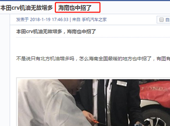 CR-V機(jī)油增多事件持續(xù)蔓延 海南再曝問(wèn)題由于此次機(jī)油增多事件更多的發(fā)生在東北,而東風(fēng)本田有意無(wú)意將問(wèn)題推給了東北的極寒天氣。但是最近在汽車論壇之中,卻有海南車主發(fā)帖訴苦,稱自己的CR-V也遇到了機(jī)油增多問(wèn)題。這是怎么回事呢? -