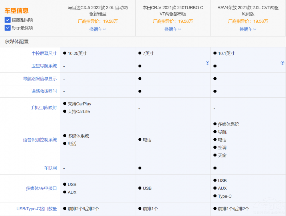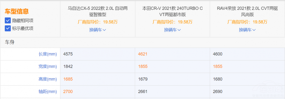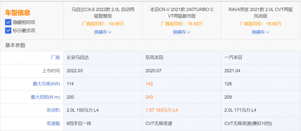 馬自達(dá)CX-5改款,改了個(gè)寂寞?作為中期改款車型,新車新增鉑雅金、晶鉆藍(lán)兩款車身深顏色,且針對內(nèi)飾配置和駕駛輔助功能方面進(jìn)行了升級,不過,新車的動力依舊維持了原來的設(shè)計(jì)。對于馬自達(dá)CX-5的改款,業(yè)內(nèi)褒貶不一。那么,在CR-V、RAV4一眾強(qiáng)手面前,馬自達(dá)CX-5可以跟它們搶份額嗎?為了知道這三臺車的差距,我們選取售價(jià)類似的三款車型進(jìn)行對比。
