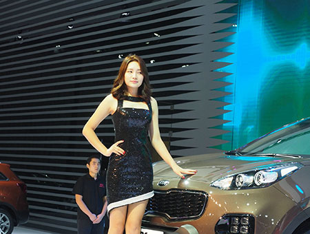 起亞美女車模挺胸站立 微微一笑分外勾人